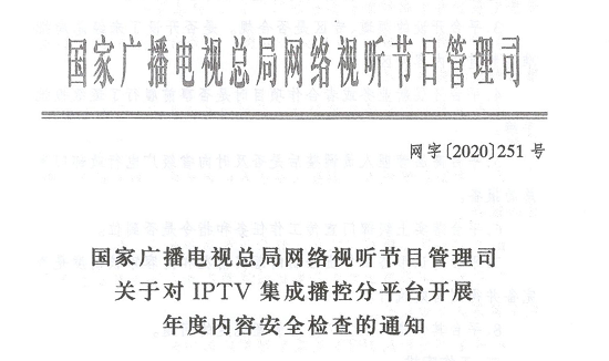 為深入貫徹落實中央關(guān)于加強(qiáng)意識形態(tài)工作責(zé)任制的要求,推動IPTV健康發(fā)展,請各省級廣電行政部門組織對屬地IPTV集成播控分平臺開展年度內(nèi)容安全檢查,相關(guān)工作要求通知如下;